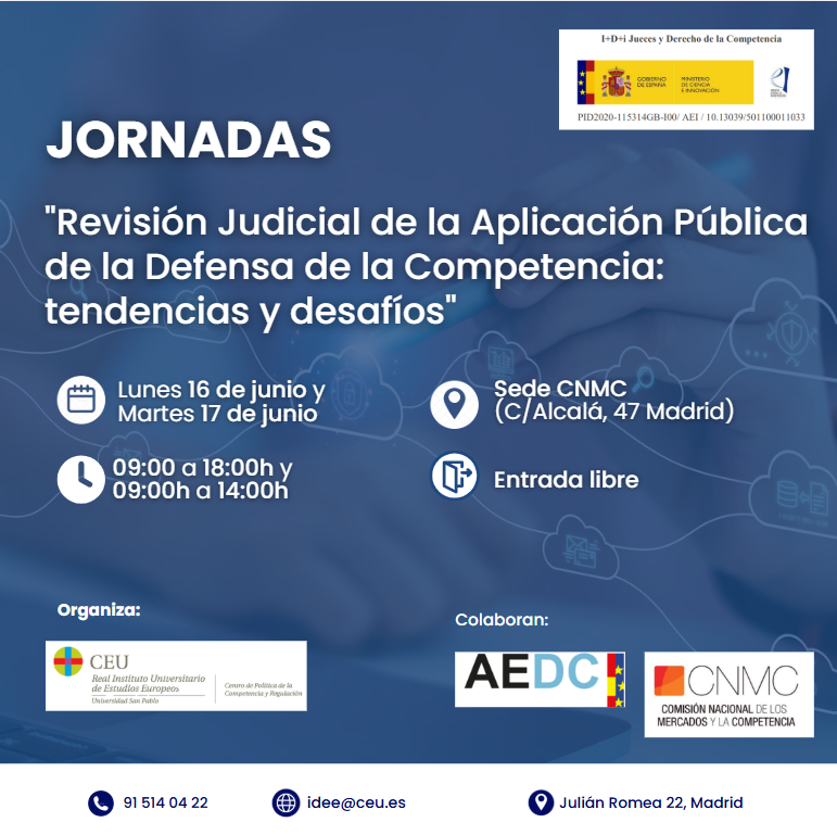 El Centro de Política de la Competencia y Regulación (CPCR) del Real Instituto Universitario de Estudios Europeos de la Universidad San Pablo CEU, dentro del proyecto de I& D del Plan Nacional Jueces y Derecho de la Competencia (Ref. PID2020-115314GB-I00, Ministerio de Ciencia e Innovación), en cooperación con la Comisión Nacional de los Mercados y la Competencia (CNMC) y la Asociación Española de Defensa de la Competencia (AEDC), tiene el placer de anunciar las próximas Jornadas sobre “Revisión Judicial de la Aplicación Pública de la Defensa de la Competencia: tendencias y desafíos”, que se celebrarán los días lunes 16 y martes 17 de junio en la sede de la CNMC, en Madrid.